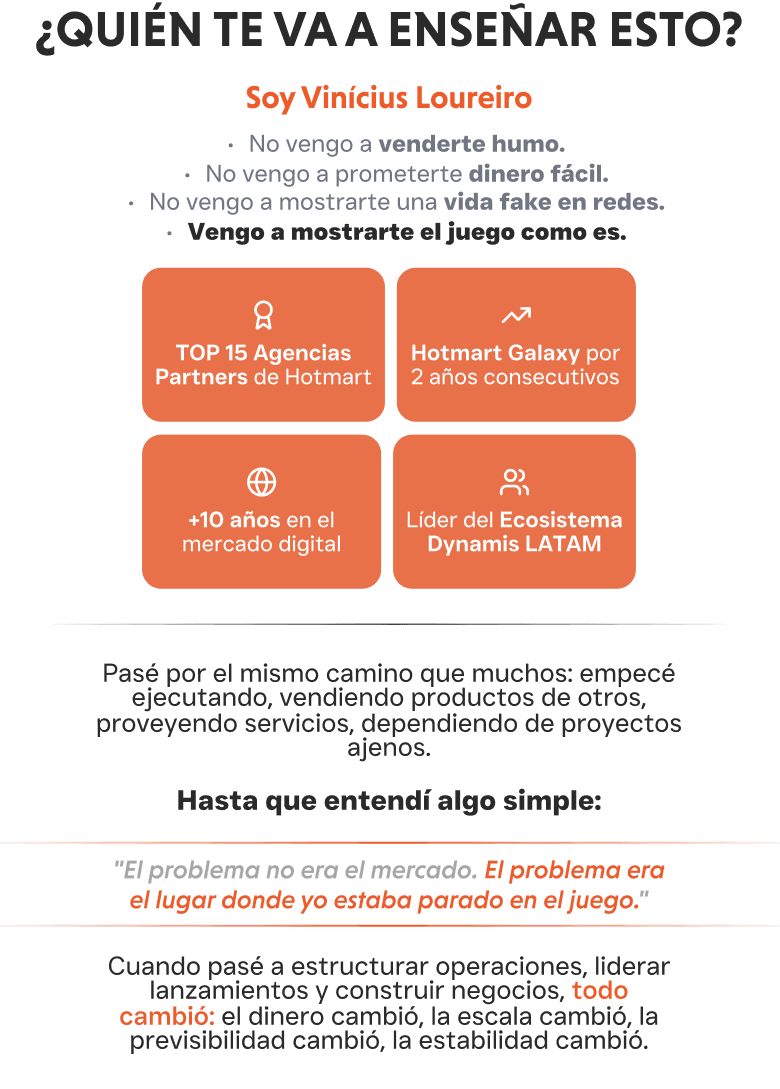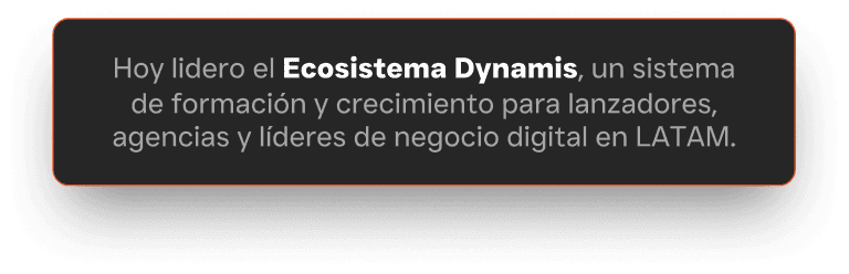 Hoy lidero el Ecosistema Dynamis, un sistema de formación y crecimiento para lanzadores, agencias y líderes de negocio digital en LATAM.