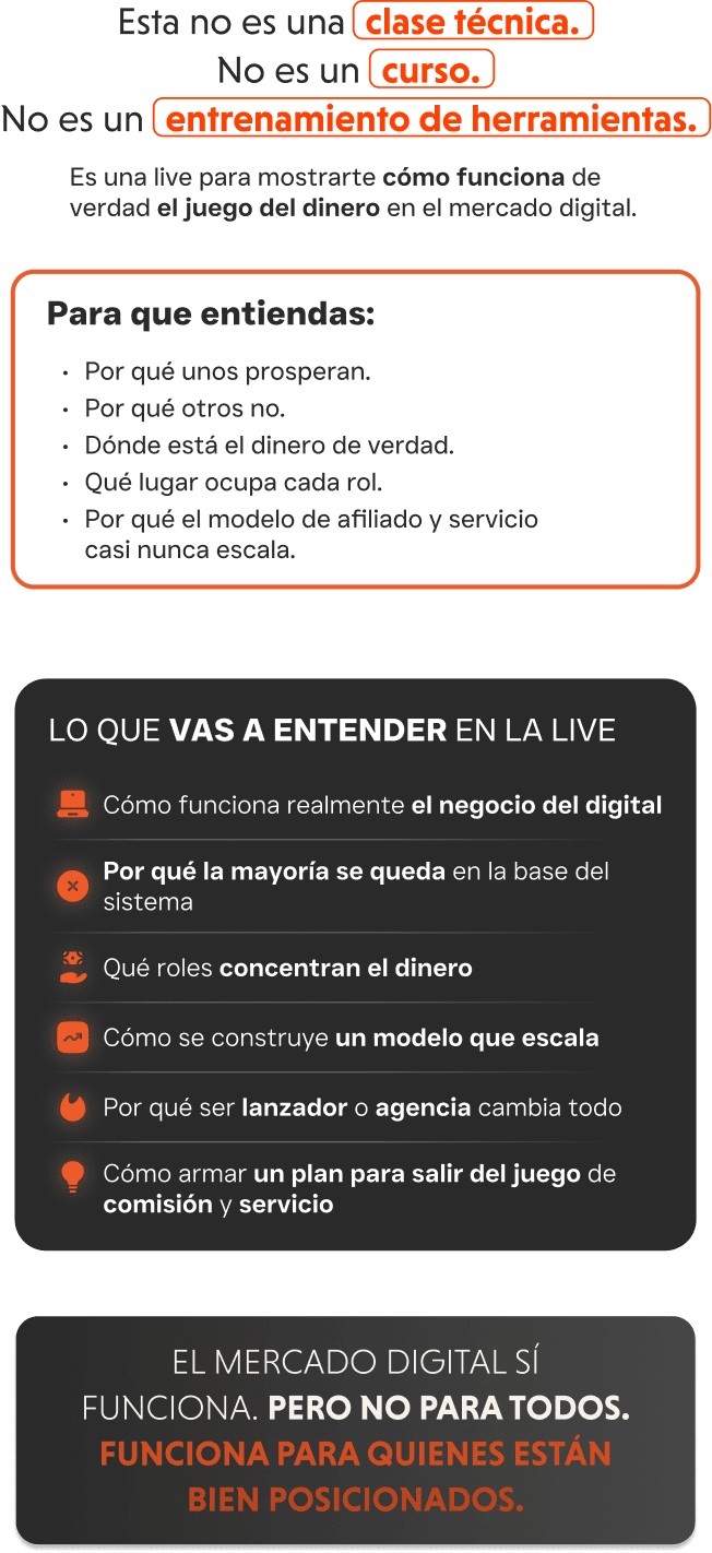 Es una live para mostrarte cómo funciona de verdad el juego del dinero en el mercado digital.