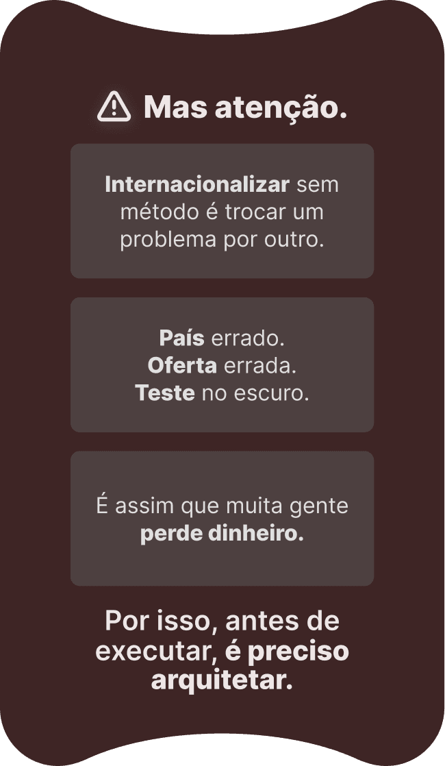 É um workshop estratégico ao vivo, em dois encontros, onde você vai desenhar a arquitetura da sua expansão internacional antes de investir pesado, contratar time ou escalar tráfego.